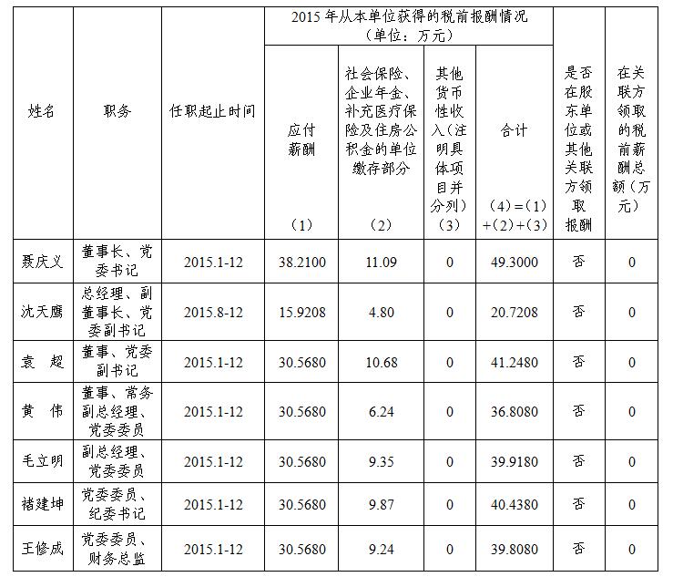 備注:上表披露薪酬為我公司領(lǐng)導(dǎo)班子2015年度全部應(yīng)發(fā)稅前薪酬。其中第1項(xiàng)由省委宣傳部核定。無在關(guān)聯(lián)單位領(lǐng)取薪酬情況;無其他需要說明事項(xiàng)。
