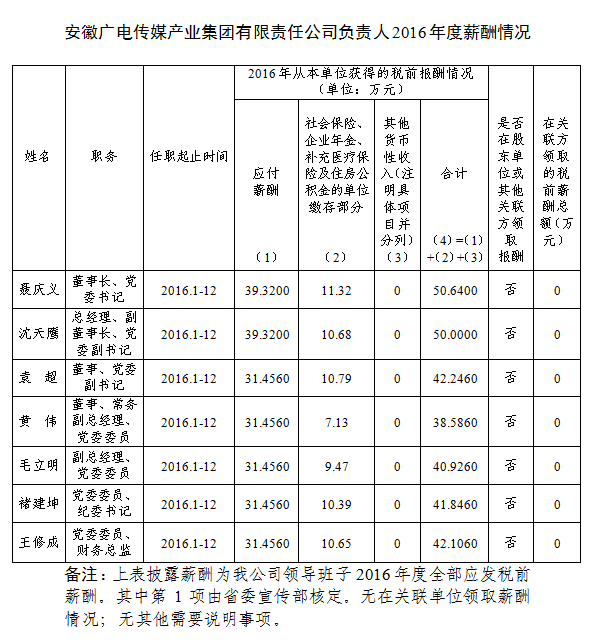 安徽廣電傳媒產(chǎn)業(yè)集團(tuán)有限責(zé)任公司負(fù)責(zé)人2016年度薪酬情況