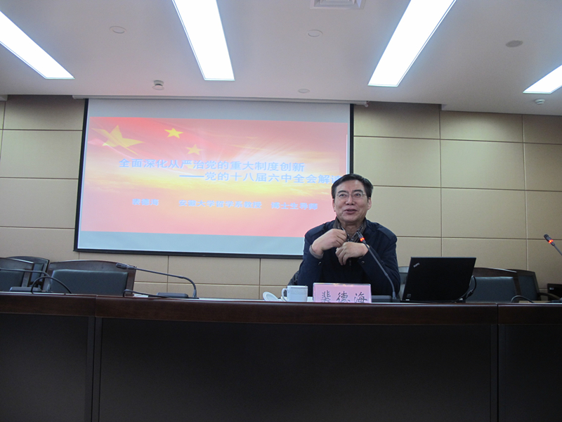 裴德海教授圍繞《全面深化從嚴治黨的重大制度創(chuàng)新》主題,從修改黨規(guī)的重要意義、《準則》與《條例》的內(nèi)容及特點、思想建黨與制度治黨的創(chuàng)新等方面,對黨的十八屆六中全會精神進行了系統(tǒng)闡述和全面解讀。報告主題鮮明、重點突出、論述精辟,既有理論高度和思想深度,又有很強的適用針對性和指導性,為集團黨員領(lǐng)導干部深入學習、準確領(lǐng)會六中全會精神,提供了理論指導。