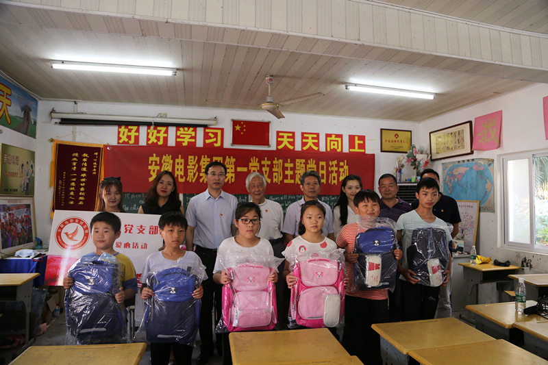 安徽電影集團(tuán)第一黨支部向孩子們捐獻(xiàn)了書(shū)包、文具等物品,并為留守兒童們播放了公益微電影《榜樣:葉連平——鄉(xiāng)村中永不熄滅的燭光》和動(dòng)畫(huà)片《哪吒之魔童降世》。
