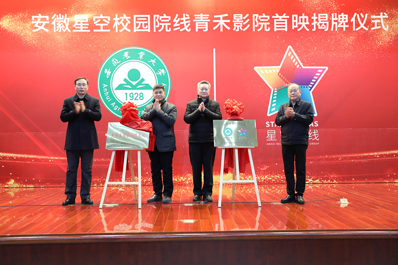 2020年12月31日,由安徽電影集團(tuán)和安徽農(nóng)業(yè)大學(xué)共同建設(shè)的“安徽星空校園院線青禾影院”揭牌首映儀式在圖書館第一報(bào)告廳隆重舉行。安徽廣電集團(tuán)黨委書記、董事長李樹,安徽農(nóng)業(yè)大學(xué)黨委書記江春出席揭牌首映儀式并致辭。集團(tuán)黨委委員、工會(huì)主席胡濱,安徽農(nóng)業(yè)大學(xué)黨委中心組成員等出席揭牌首映儀式。