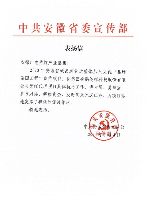 安徽廣電傳媒產(chǎn)業(yè)集團: 2023 年安徽省域品牌首次整體加入央視“品牌強國工程”宣傳項目。你集團金鵑傳媒科技股份有限公司受托代理項目具體執(zhí)行工作,講大局、勇?lián)?dāng),多方對接、籌措資金,及時高效完成任務(wù),為項目落地發(fā)揮了積極的促進作用。 特此表揚。 中共安徽省委宣傳部 2024年1月4日