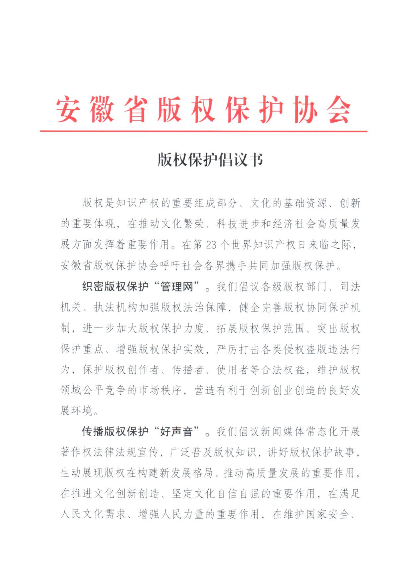 版權(quán)是知識產(chǎn)權(quán)的重要組成部分、文化的基礎(chǔ)資源、創(chuàng)新的重要體現(xiàn),在推動文化繁榮、科技進(jìn)步和經(jīng)濟社會高質(zhì)量發(fā)展方面發(fā)揮著重要作用。在第23個世界知識產(chǎn)權(quán)日來臨之際,安徽省版權(quán)保護(hù)協(xié)會呼吁社會各界攜手共同加強版權(quán)保護(hù)。