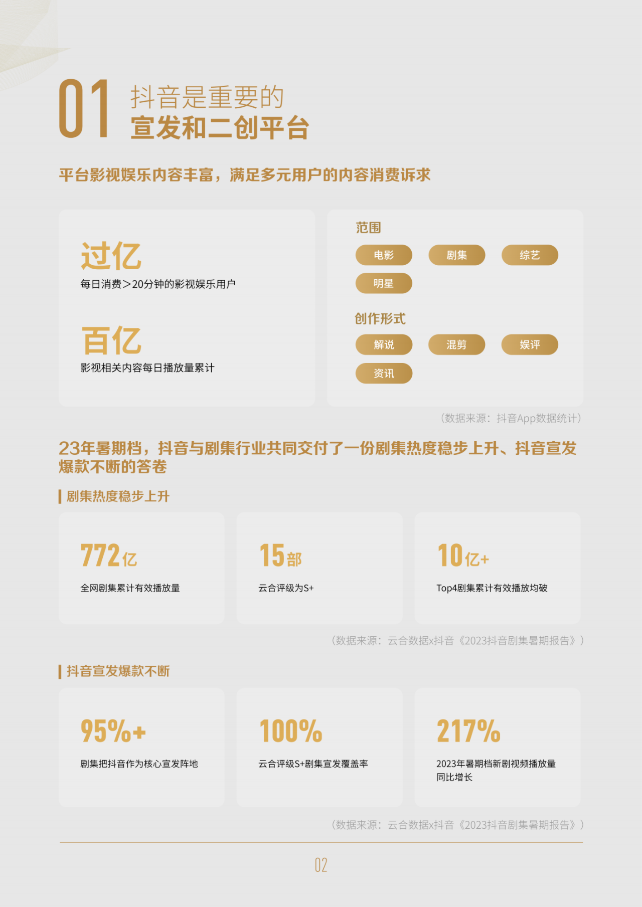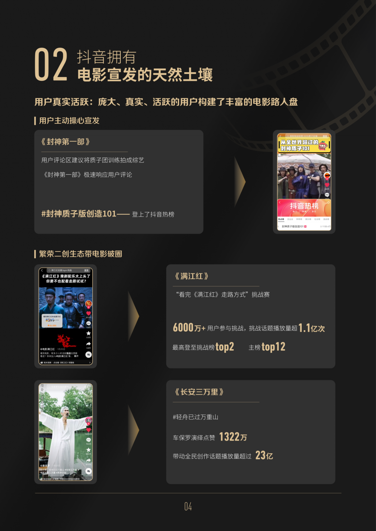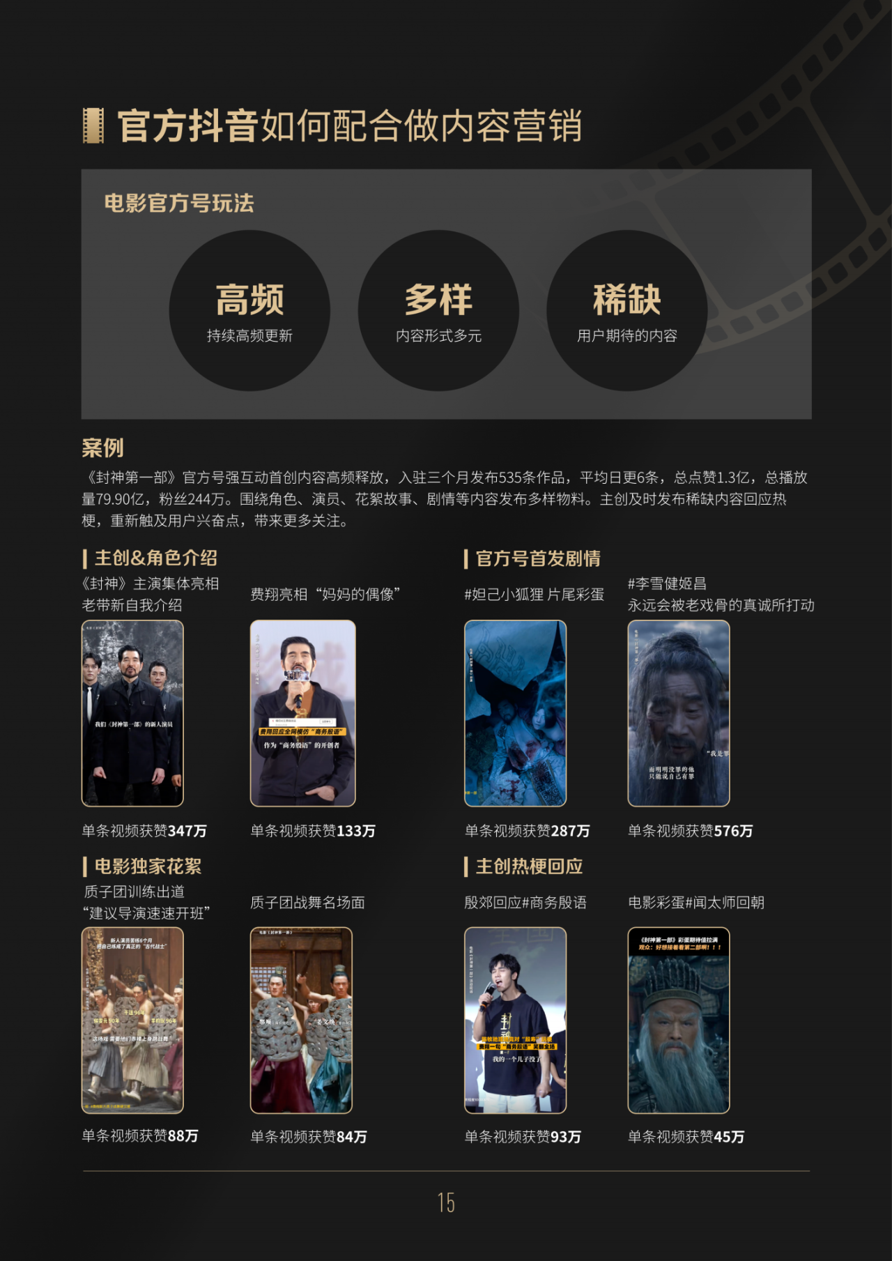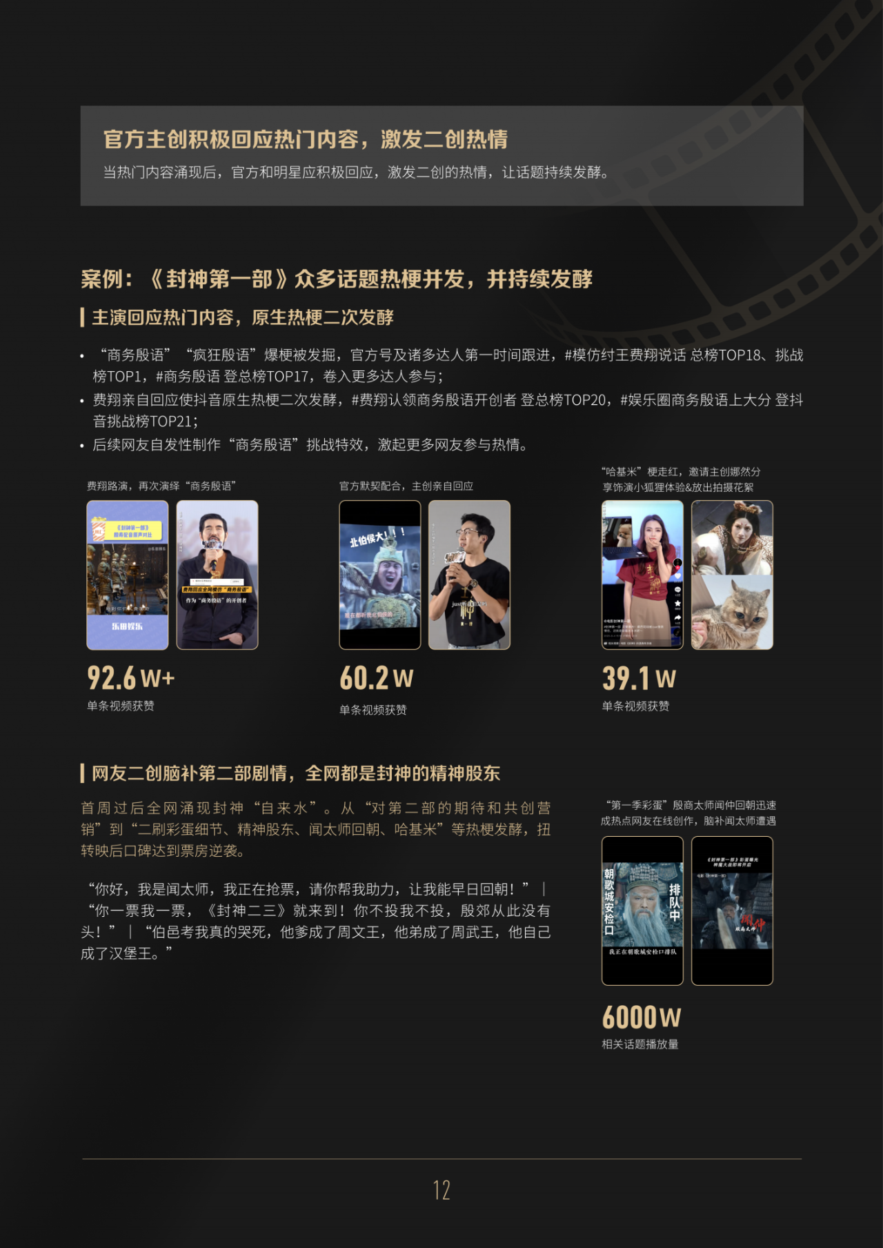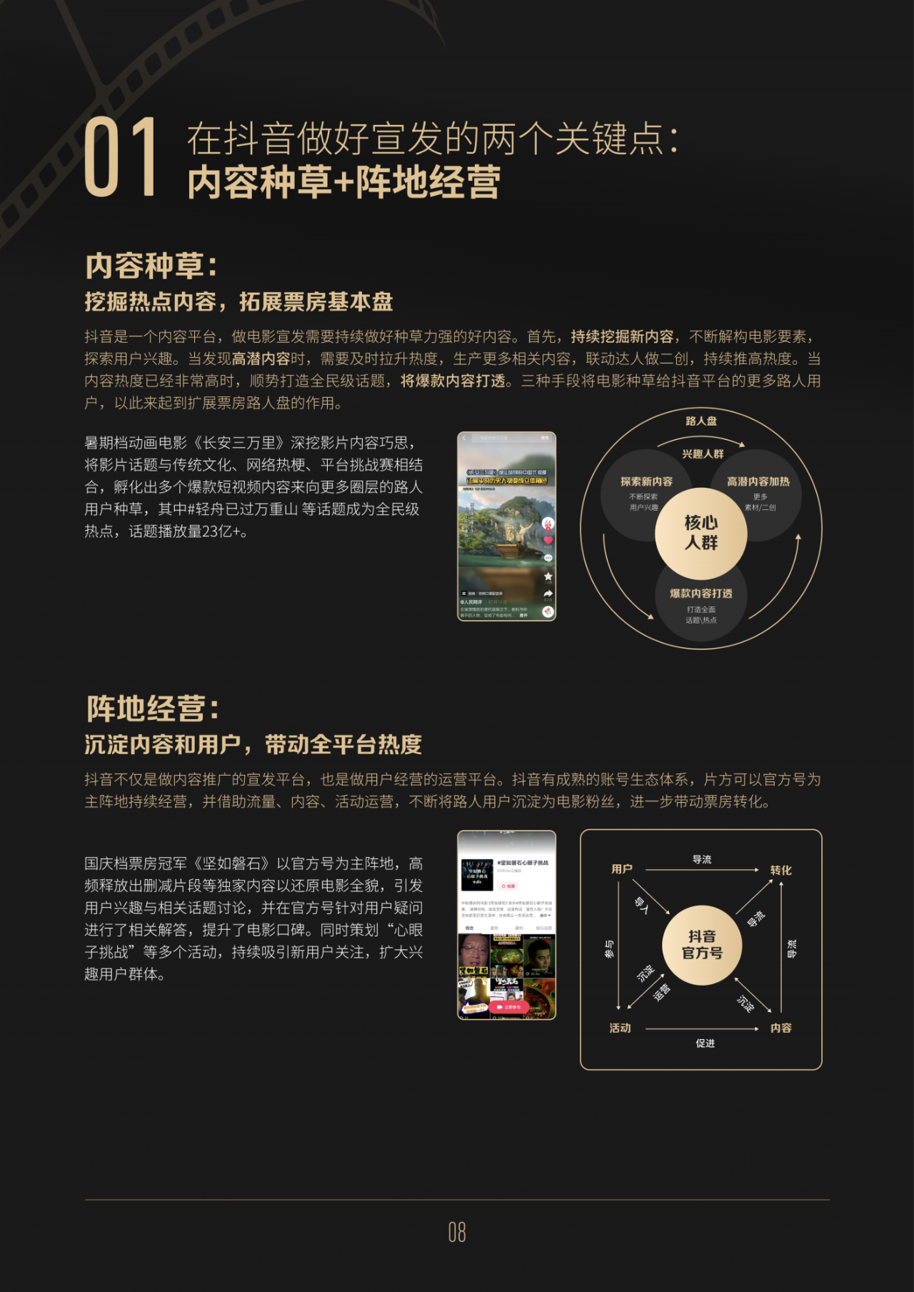 近日,抖音發(fā)布《抖音電影宣發(fā)方法指南》與《抖音劇集宣發(fā)方法指南》?!抖兑綦娪靶l(fā)方法指南》圍繞內(nèi)容種草、陣地經(jīng)營兩個(gè)核心方法,基于抖音電影指數(shù)及相應(yīng)產(chǎn)品,為行業(yè)提供電影宣發(fā)新解法。《抖音劇集宣發(fā)方法指南》通過對爆款劇集宣發(fā)經(jīng)驗(yàn)的梳理,外放劇集宣發(fā)方法論,并發(fā)布抖音劇集指數(shù),助力更多優(yōu)質(zhì)劇集實(shí)現(xiàn)內(nèi)容與商業(yè)價(jià)值的突圍。