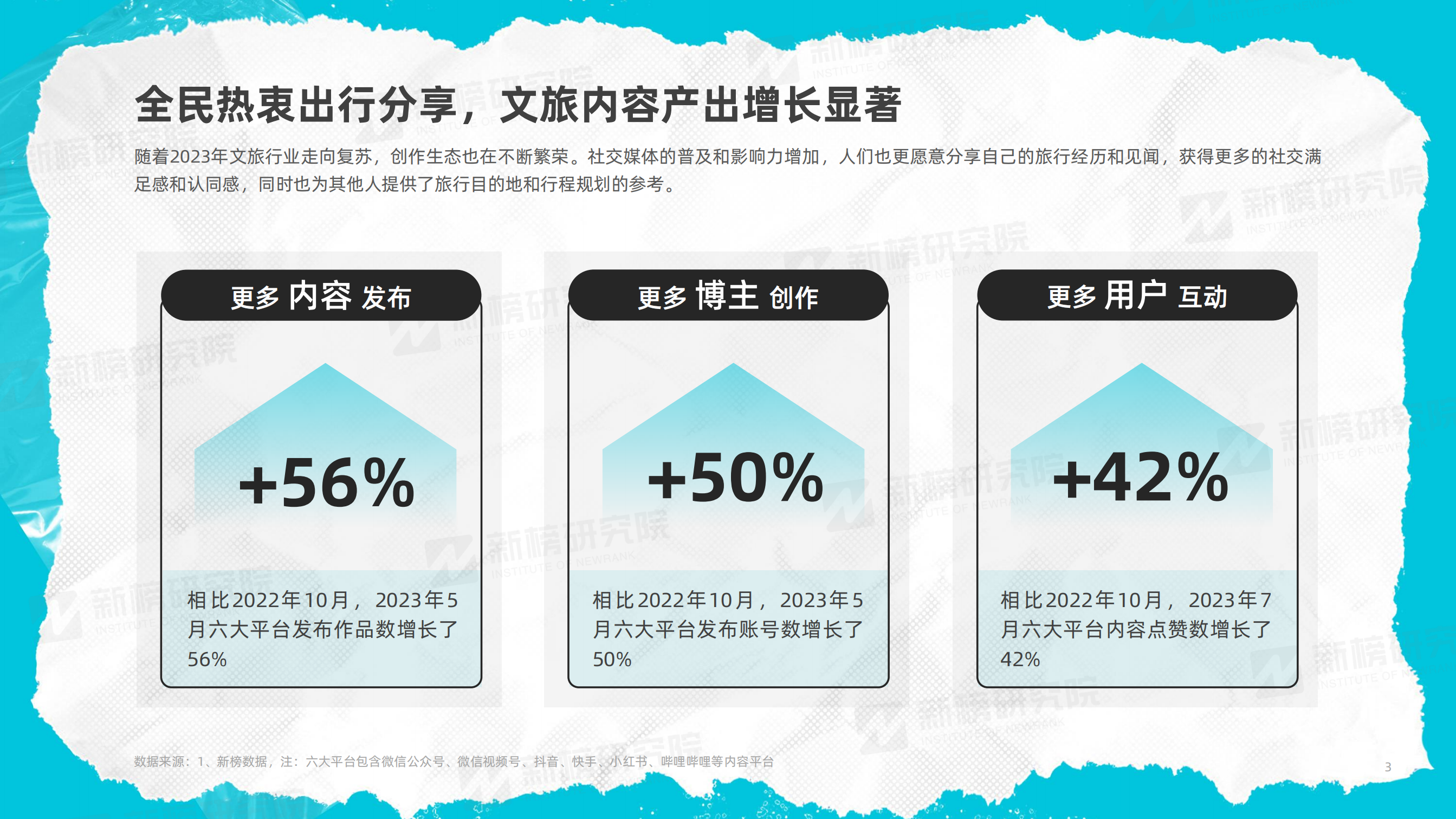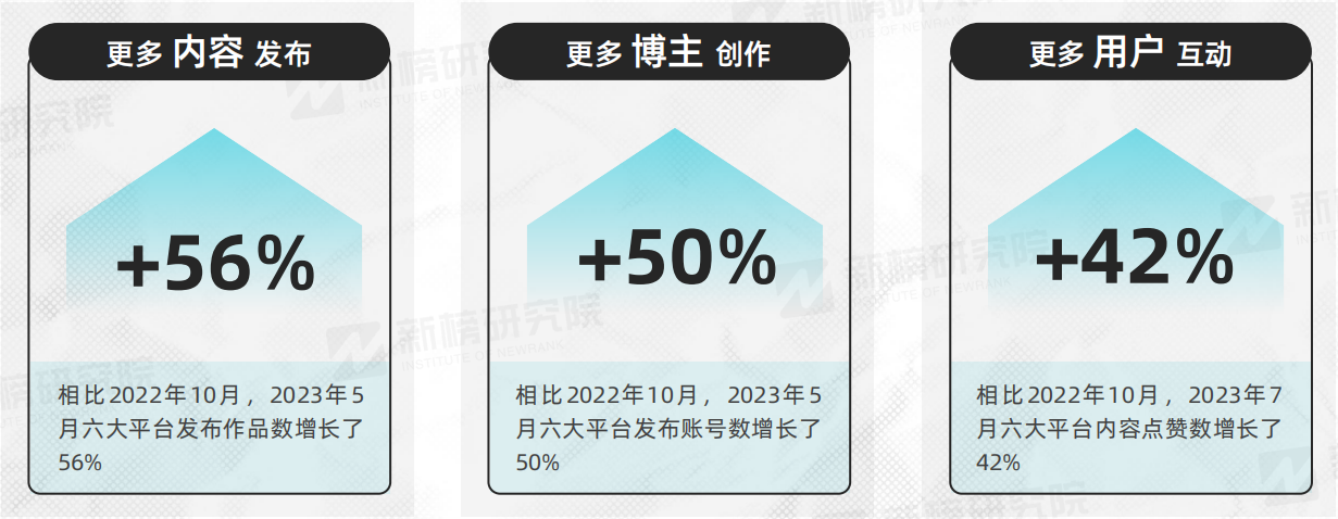 2023年文旅行業(yè)的復蘇也帶來了內(nèi)容創(chuàng)作生態(tài)的繁榮。新榜數(shù)據(jù)顯示,無論從發(fā)布內(nèi)容、創(chuàng)作博主還是用戶互動數(shù)量上,較去年均有明顯提升。