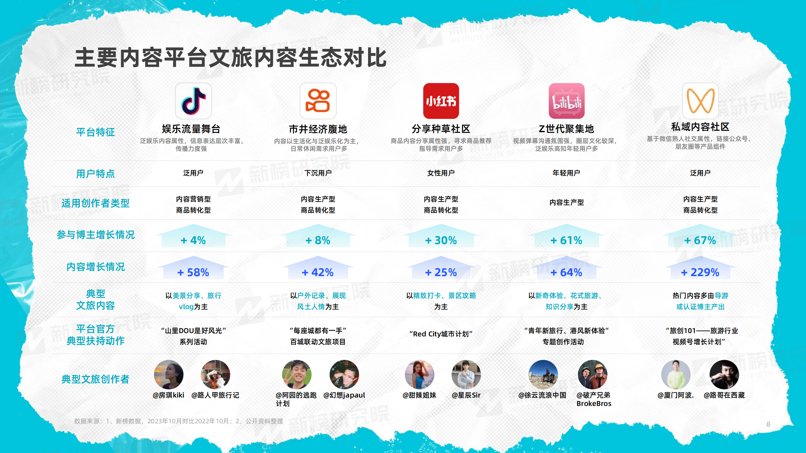 由此,新榜推出《2023年度文旅內(nèi)容洞察報告》,旨在通過對抖音、快手、小紅書、B站、視頻號等平臺的文旅內(nèi)容以及熱門旅行方式的多維度觀察,展現(xiàn)2023年文旅行業(yè)內(nèi)容的發(fā)展現(xiàn)狀,為相關從業(yè)者提供相應的策略建議。