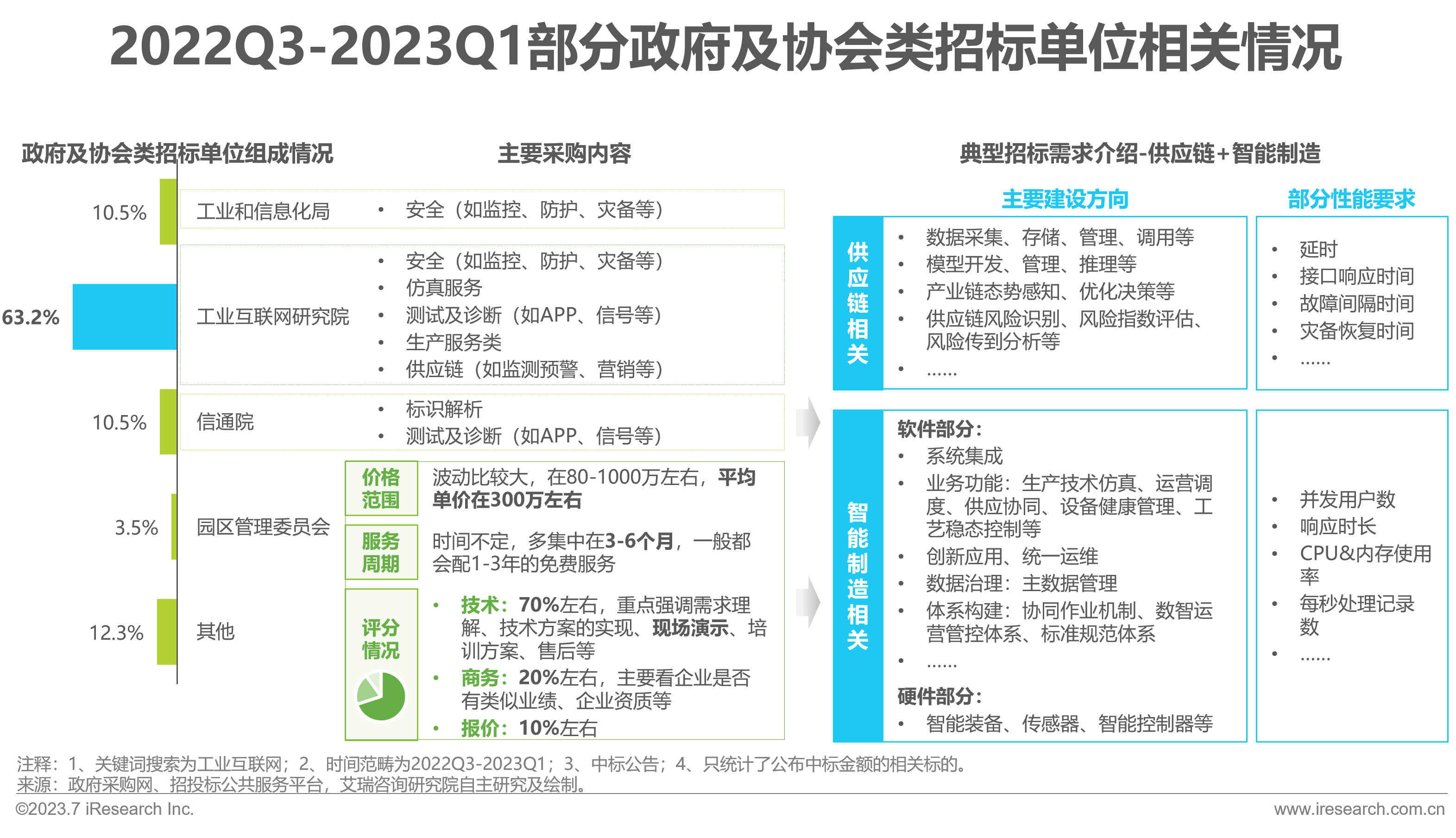 從招標主體看:1)工業(yè)互聯(lián)網(wǎng)研究院占據(jù)絕對主體,其扮演角色除了不斷豐富完善自身工業(yè)互聯(lián)網(wǎng)領域的測試、評估等服務能力外,更多扮演了集成分包商的角色這也說明未來參與行業(yè)標準制定的領頭羊將會更具有集成優(yōu)勢;2)除了工業(yè)互聯(lián)網(wǎng)研究院外,工業(yè)和信息化局是更具代表性的需求方,他們更加關注工業(yè)互聯(lián)網(wǎng)為當?shù)卣w產業(yè)的賦能,故對產業(yè)鏈協(xié)同管理、智能制造等需求較高。