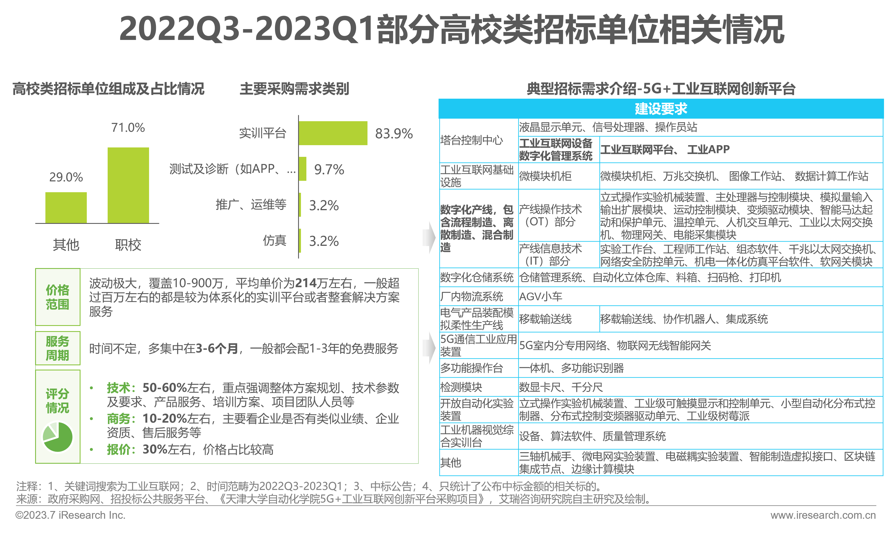 高校對工業(yè)互聯(lián)網(wǎng)的需求主要是建設實訓平臺所推動的,占比為83.9%。與政府側和企業(yè)側相比,高校側主要有兩點差異:1)更多的是資金驅動,學校不同,實訓平臺建設內容不同,大部分的高校還是以單一模塊的實訓建設為主,只有很少一部分會關注整個產線的實訓;2)在招標評分中,技術分占比為50-60%,而報價分占30%左右。