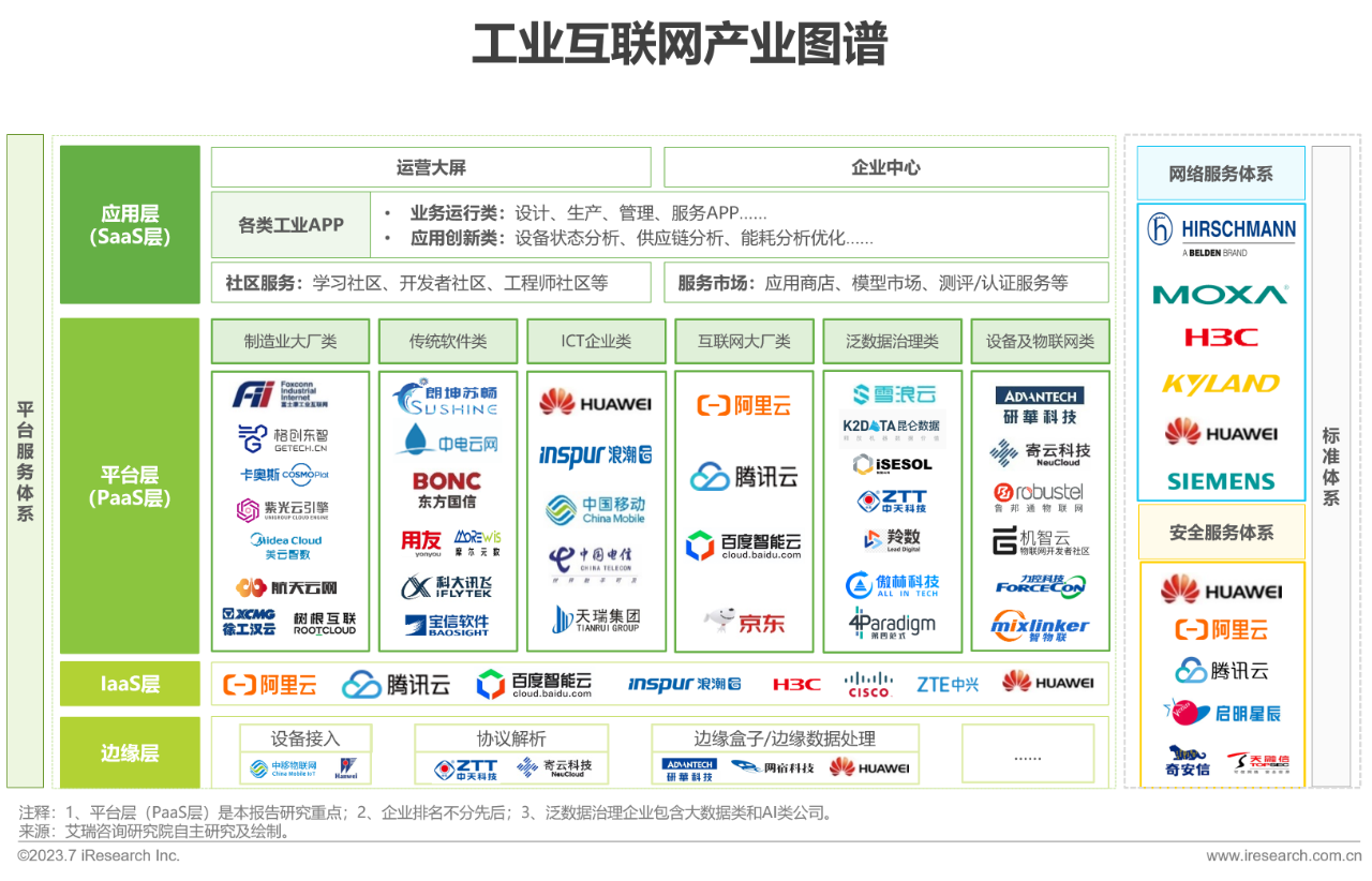 工業(yè)互聯(lián)網(wǎng)玩家涵蓋平臺服務、網(wǎng)絡服務、安全服務及標準服務四個體系,其中平臺服務玩家主要集中在平臺層(PaaS層)