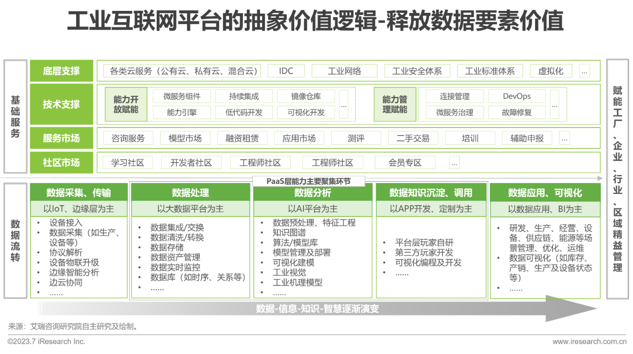 工業(yè)互聯(lián)網(wǎng)平臺的核心是釋放企業(yè)經(jīng)營活動形成的數(shù)據(jù)資產的價值,其中“數(shù)據(jù)從哪里來、數(shù)據(jù)怎么用、數(shù)據(jù)價值如何構建”等是平臺企業(yè)需要考慮并解決的主要問題。當前市場上工業(yè)互聯(lián)網(wǎng)平臺企業(yè)主要具備兩大類能力:其一,基礎服務能力(如底層支撐、技術支撐),其通用屬性更強;其二,圍繞數(shù)據(jù)生命周期提供服務,覆蓋數(shù)據(jù)采集及傳輸-數(shù)據(jù)處理-數(shù)據(jù)分析-數(shù)據(jù)知識沉淀及調用-數(shù)據(jù)可視化應用等全周期,涵蓋物聯(lián)網(wǎng)、大數(shù)據(jù)、AI等各類技術,其中數(shù)據(jù)分析、數(shù)據(jù)知識沉淀的專用屬性更強,也是行業(yè)壁壘、企業(yè)服務壁壘的重要體現(xiàn)。從輸出的服務體系來看,工業(yè)互聯(lián)網(wǎng)平臺服務商已初步形成PaaS平臺底座+生態(tài)共筑、應用APP、綜合解決方案等服務。