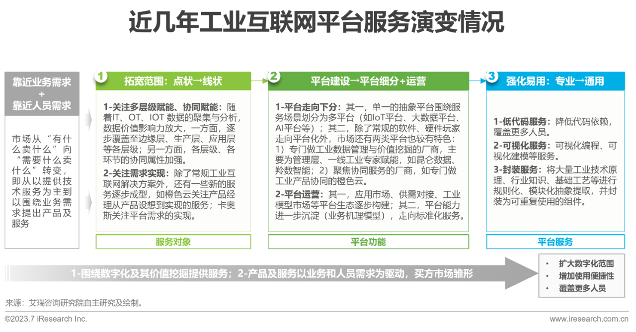 從2015年提出工業(yè)互聯(lián)網(wǎng)發(fā)展至今,工業(yè)互聯(lián)網(wǎng)服務市場整體邏輯變化不大,都是圍繞數(shù)字化及數(shù)據(jù)價值挖掘而推出各類產品及服務。但隨著客戶對產品及服務、自身需求的認知提升,供給方的產品和服務主要向三大方向演進:1)覆蓋更廣的范圍,具體表現(xiàn)為在產品及服務端,邊緣層、生產層、應用層的協(xié)同管理及賦能屬性更強;在需求實現(xiàn)端,新型的、覆蓋更長服務鏈條的平臺逐步出現(xiàn),如橙色云關注產品經(jīng)理從產品設想到實現(xiàn)的服務。2)平臺走向細分,并趨于運營:其一,針對細分,主要圍繞服務場景進行,一方面,單一平臺依據(jù)應用場景而劃分為多平臺(如IoT平臺、大數(shù)據(jù)平臺、AI平臺等);另一方面,主打為管理層、一線工業(yè)專家賦能的廠商紛紛出現(xiàn)。其二,針對運營,相對成熟的平臺開始在生態(tài)構建、知識沉淀等方面發(fā)力,試圖增加變現(xiàn)可能。3)強化易用屬性,試圖讓更多懂工業(yè)生產及運營的人能“跨壁壘”使用相關產品及服務,放大服務價值。