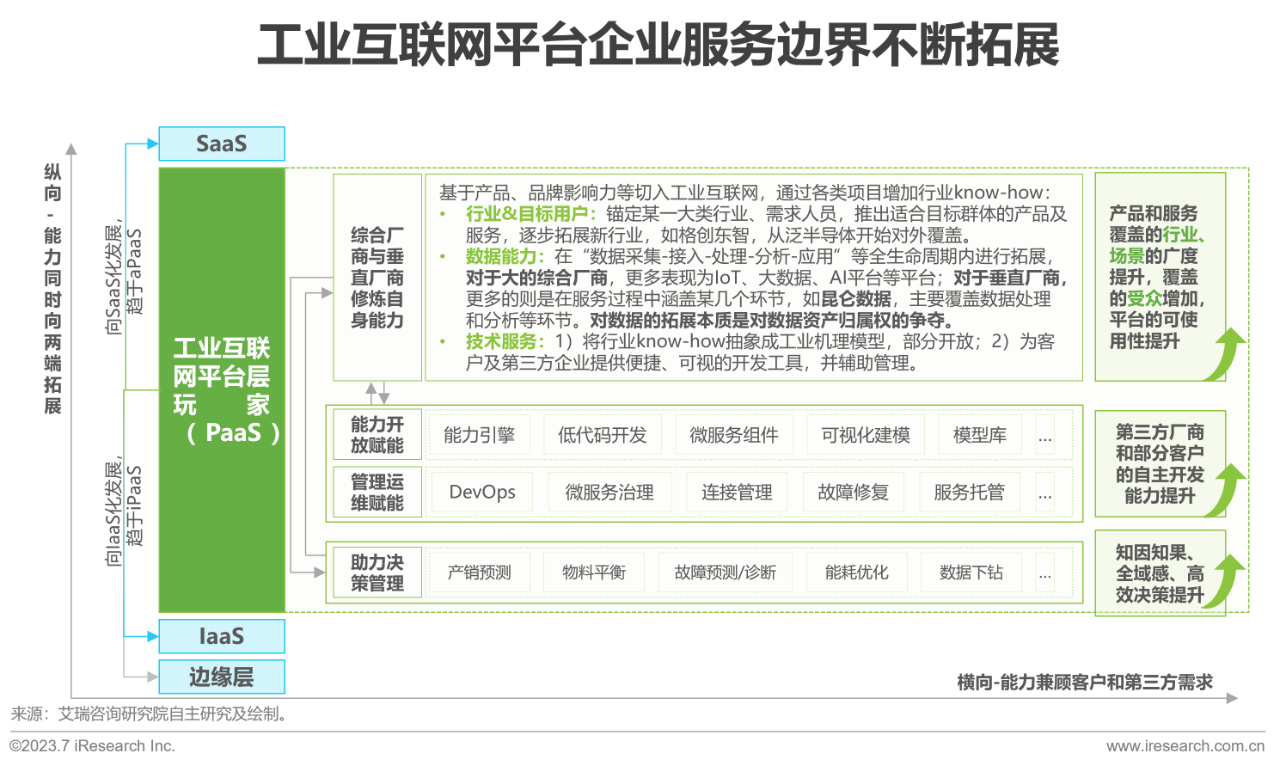 近幾年,隨著工業(yè)互聯(lián)網(wǎng)平臺層企業(yè)服務客戶的經(jīng)驗積累,對市場需求認知加深,平臺層企業(yè)對自身能力構建的認知相對更加清晰,對外表現(xiàn)為服務能力走向細分的同時,其服務的邊界不斷拓展,具體表現(xiàn)為:1)從橫向看,平臺層企業(yè)主要從行業(yè)&目標用戶、數(shù)據(jù)服務能力、技術服務能力三方面發(fā)力,對于前兩種能力,其路徑多為一到多,逐步拓展;對于第三種能力,往往需要經(jīng)過一定積累后,逐步對外開放,且純技術的開放更多的是綜合廠商平臺;2)從縱向看,部分平臺層企業(yè)能力逐漸向aPaaS和iPaaS能力演進,且多為橫向拓展驅動縱向拓展。