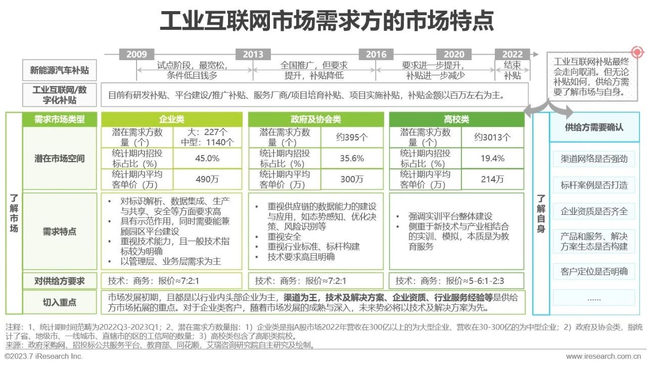 與新能源行業(yè)類似,工業(yè)互聯(lián)網(wǎng)/數(shù)字化的補貼也將經(jīng)歷從寬松到收緊、從高補貼到低補貼,甚至是取消補貼的過程。就工業(yè)互聯(lián)網(wǎng)市場長期發(fā)展而言,無論補貼持續(xù)時間多久,未來是否存在,供給方最終都需要滿足用戶的需求。因此供給方企業(yè)都需要結合渠道關系、技術及解決方案、企業(yè)資質、行業(yè)服務經(jīng)驗等市場拓展重點,明晰自身優(yōu)勢,確認產品及服務特點,錨定適合自身的賽道和客戶,方能適應市場變化。