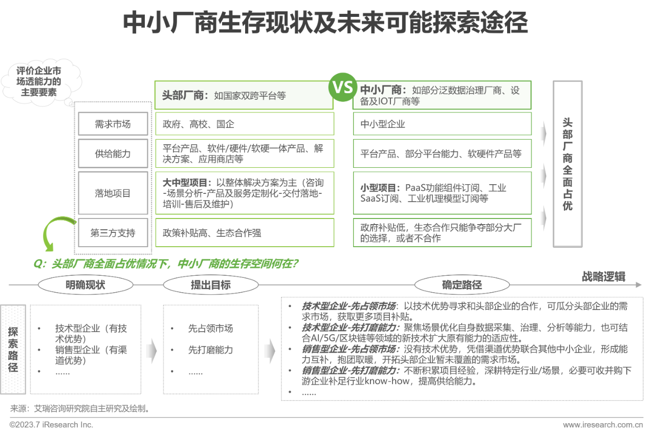 在滲透能力遠不如頭部廠商的情況下,中小廠商應結合自身現(xiàn)狀和目標切入市場,或尋求頭部合作瓜分已有市場蛋糕,或抱團取暖定位于中小企業(yè)市場服務,或深耕熟悉行業(yè)/場景,提高自身供給能力,或結合數(shù)據(jù)、網(wǎng)絡、計算等相關新興技術,實驗新的增長點。