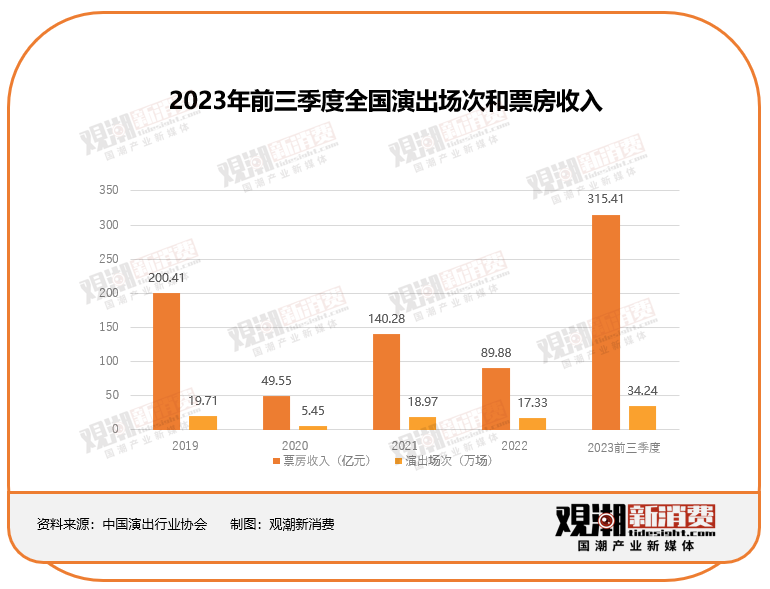 中國演出行業(yè)協(xié)會(huì)的數(shù)據(jù)顯示,2023年前三季度,國內(nèi)的演出場(chǎng)次達(dá)到34.24萬場(chǎng),票房收入315.41億元,均已遠(yuǎn)遠(yuǎn)超過2019年全年的水平。