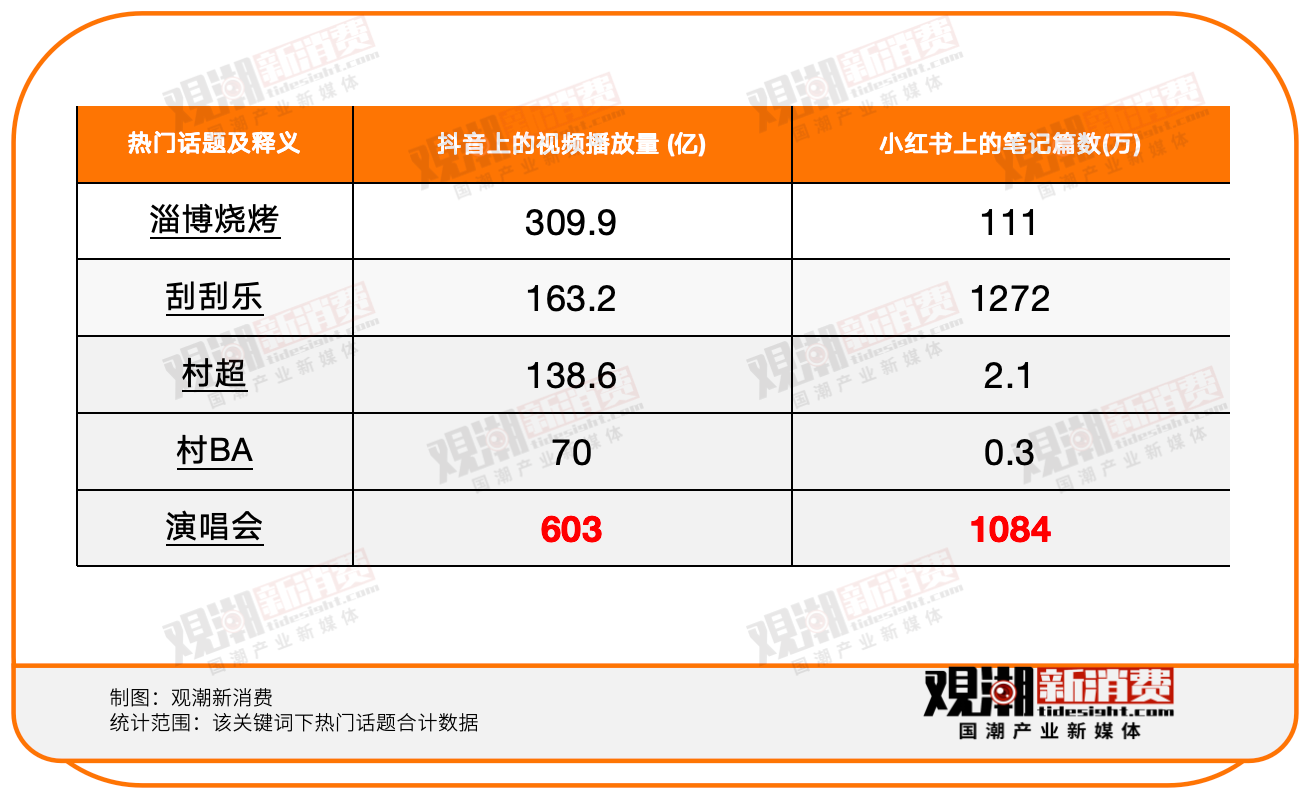 演出結(jié)束后,許多觀眾會(huì)在社交媒體上分享他們的票根、現(xiàn)場(chǎng)照片和評(píng)論,表達(dá)自己的感受。根據(jù)觀潮新消費(fèi)在主流社交媒體平臺(tái)的數(shù)據(jù)統(tǒng)計(jì),在抖音、小紅書等社交媒體平臺(tái)上,演唱會(huì)播放量和筆記篇數(shù)普遍領(lǐng)先其他熱門話題。