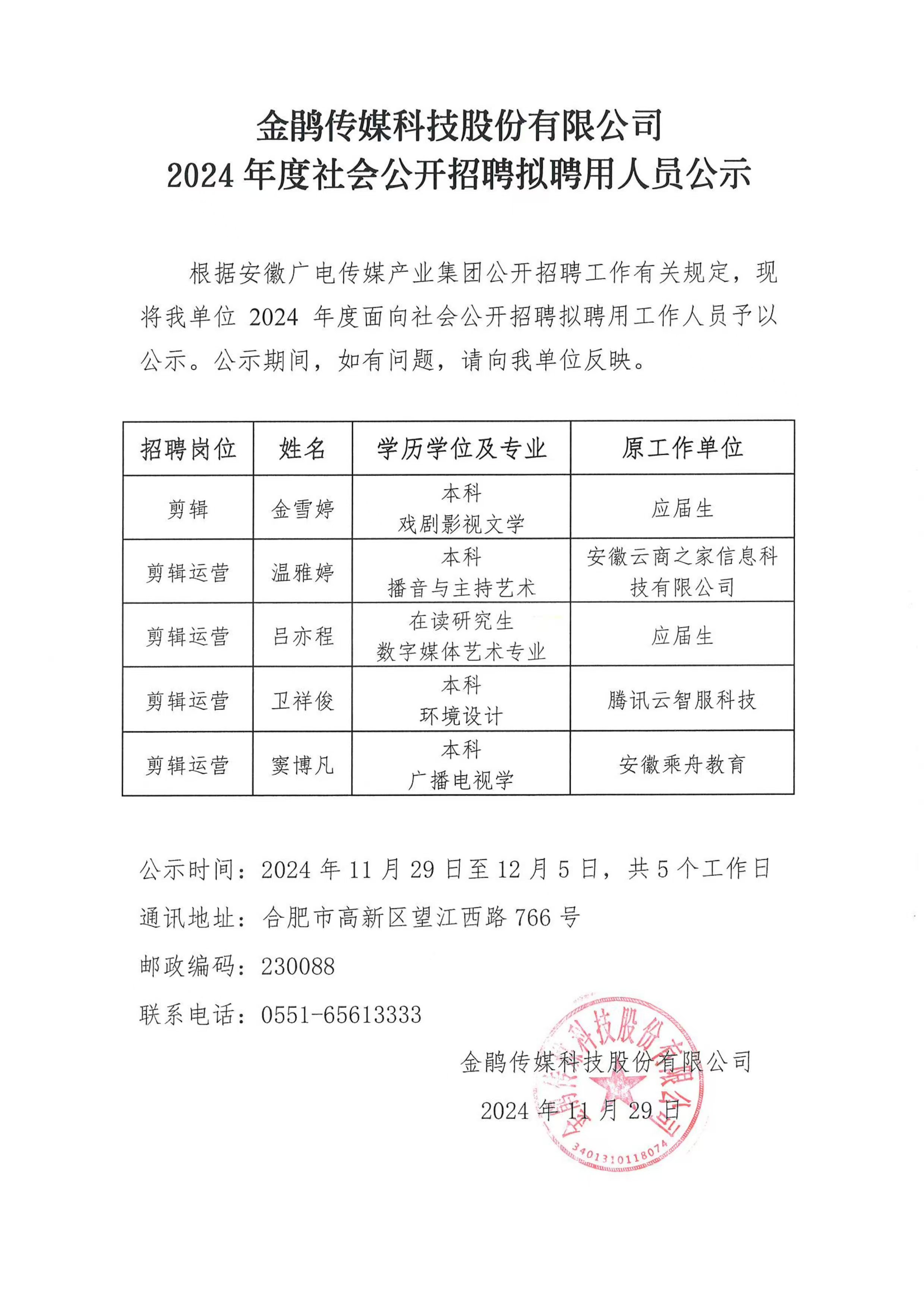 金鵑傳媒科技股份有限公司2024年度社會公開招聘擬聘用人員公示