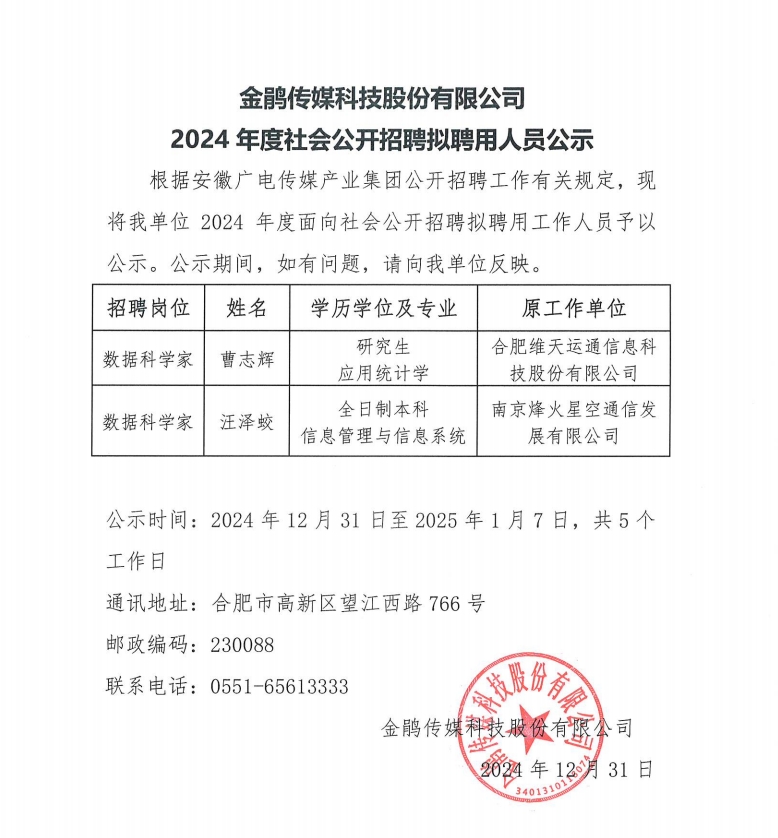 金鵑傳媒科技股份有限公司2024年度社會公開招聘擬聘用人員公示