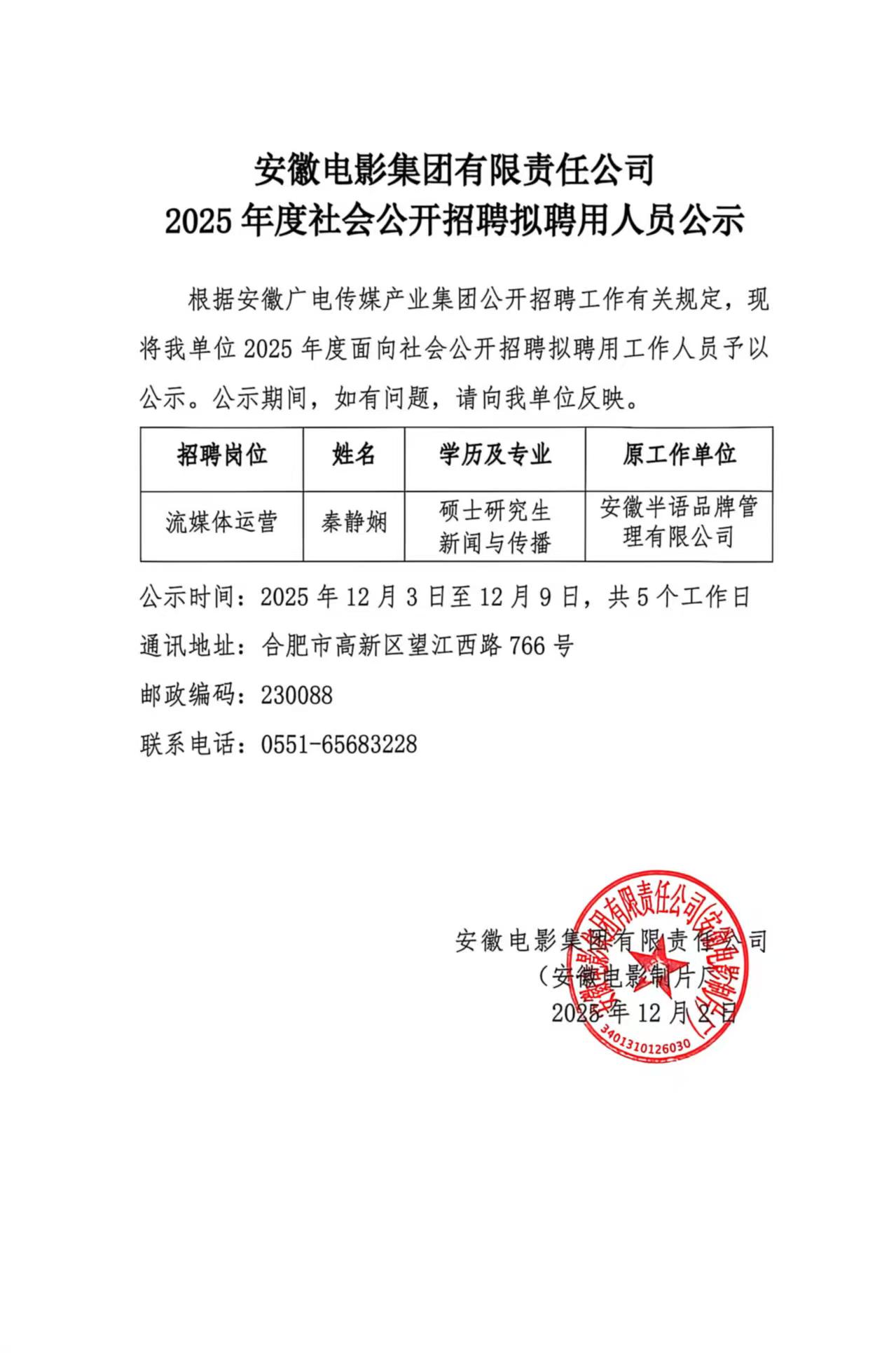 安徽電影集團有限責任公司2025 年度社會公開招聘擬聘用人員公示